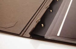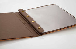 Le modèle FINESSO est un porte-menu modulable. À l'intérieur la charnière de fixation est composée soit d’une bande magnétique, de vis ou de bouton-pression. Vous pouvez y fixer des feuilles de papier libre ou des pochettes pvc souple.